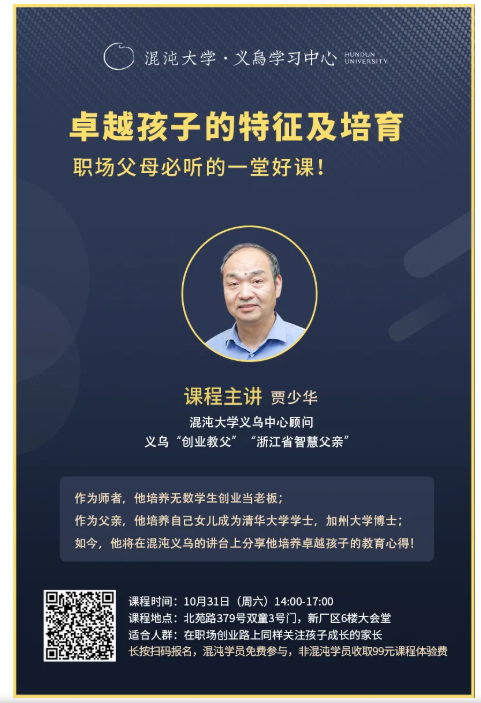 10月31日下(xià)午,我們將邀請“混沌大學義烏中心顧問”賈少華院長,為混沌(dùn)義烏的(de)同學們獻(xiàn)上一堂(táng)“創業者子女教(jiāo)育”的饕餮知識(shí)盛宴——《卓越孩子的(de)特征及培養:家庭教育的實(shí)踐和藝術》專題講座,從切身經驗出發,分享(xiǎng)自己培育孩子(zǐ)成(chéng)為清華大學(xué)學士、美國加州大學博士的家庭教育心得。