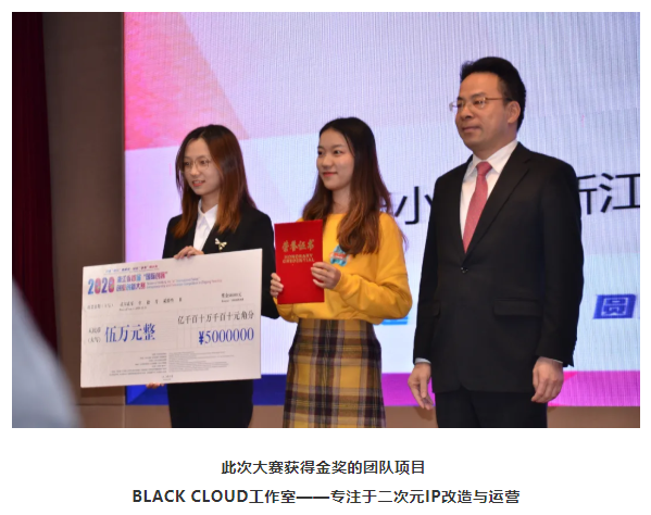 憑借超力強的實力水準,最終,程佳瑩、高田曜、王涵譽、黃雯靜、丁綺、柯銘穎團隊的項目《BLACK CLOUD工作室——專注於二次元IP改(gǎi)造與運營》榮獲本次大賽的(de)金獎,並領取了(le)5萬元參賽獎金。