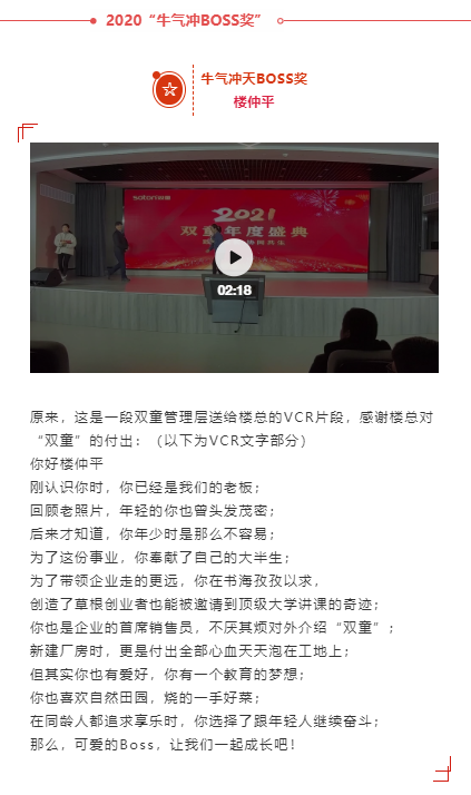2020年是疫情突發(fā)年,我們的產值也受到了前所未有(yǒu)的挑戰,國外貿易大幅下降,幸而國內貿易在今年異軍突起。在此,我對“.17c嫩嫩草色视频”所有員工表示感謝。馬上2021年(nián)迎麵向我們走來,而2021年又是充滿機會和(hé)挑戰的一(yī)年,我們麵前隻有一條路:做好自己、迎接(jiē)挑戰、創造未來(lái)!除了給(gěi)優秀奮鬥者頒發了獎項之外,“.17c嫩嫩草色视频”全(quán)體員工還為我們的Boss——樓仲平準(zhǔn)備了一個驚喜!到底是什麽驚喜呢?戳視頻一起來看看:最後,總經理(lǐ)李二橋現場為(wéi)樓總頒(bān)發了“牛氣衝天BOSS獎”!願公司在兩(liǎng)位Boss的帶領下,“雙(shuāng)童”在2021年(nián)度能夠能(néng)蒸蒸日上,越來越好!