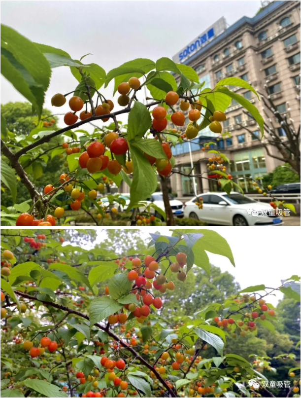 看!“雙(shuāng)童”的櫻桃樹上(shàng)綴滿了櫻桃果,茂密的櫻葉也遮蓋不住紅橙相間的果實。“小燈籠”們(men)散發出陣陣誘人果(guǒ)香,讓人不禁胃(wèi)口大開,口水直流!