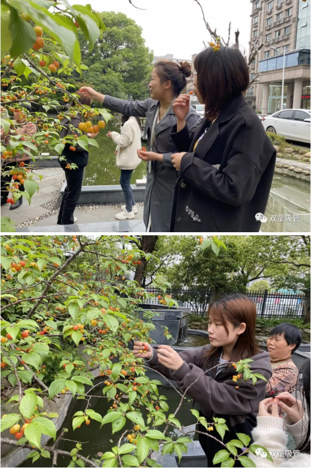 咦(yí)?櫻桃樹上除了有(yǒu)櫻桃,還有(yǒu)一塊牌子呢!原來,為了讓櫻桃樹更好的生長,“雙(shuāng)童人”在每棵(kē)櫻桃樹上(shàng)都掛(guà)了(le)標語牌,提醒大家在摘櫻桃時不要折損(sǔn)傷害櫻桃樹(shù)。