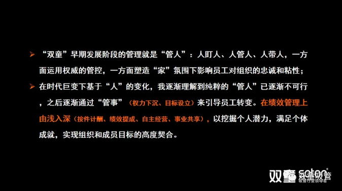 “雙(shuāng)童”在以往的管理形式上采取“管人”的模式,各項事務都通過層級指令、管(guǎn)控執行。在時代巨變下(xià),基於“人”的變化,我(wǒ)們理解到純粹的“管人”已逐漸不可行。