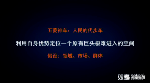 那麽它運用(yòng)的是什麽原理呢?大家不妨思(sī)考一下! 是升維拆解嗎?顯然不是!這(zhè)實際上是通過假設挖(wā)掘出一個更為底層的主流(liú)消費群體,滿足了大眾更為廣泛(fàn)的需求,從而在原有市場之外找到了自己的生態位,建立起自身獨特的創新模(mó)式,那麽這種模式就是“降(jiàng)維拆解(jiě)”。 所以,五菱宏光MINI電動車的(de)廣告(gào)詞非(fēi)常(cháng)精準(zhǔn),叫做“人民的代步車”,人民就是它的認知前提,代步車是它的產(chǎn)品消費定位群體,利用自身(shēn)優勢定位一個原(yuán)有巨頭極(jí)難進入的空間,從而打開新的市場。