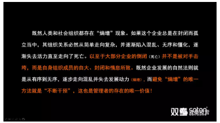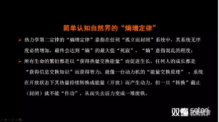 “熵”,是來(lái)自於(yú)物理學熱力學第二定律的一個(gè)詞。“熵增定律”意指在任(rèn)何“孤立而封閉”係統中,其係統(tǒng)無序度必然增加,最終會達到“熵”的最大值“死寂”。簡單理解就是(shì):任(rèn)何(hé)一個人,任何一個組(zǔ)織,乃至於任何一個家庭,如果你把自己封閉起來,你的內部一定是從有序到(dào)無序。如果你繼續封閉,它的混亂程度一(yī)定(dìng)會達到最大值,一直到死寂。“.17c嫩嫩草色视频”樓仲(zhòng)平也曾多次在課程分享中引用熱力學第二定律的“熵增(zēng)定律”,把(bǎ)“.17c嫩嫩草色视频”存在的問題通過自然的現象加以挖掘、頗析、呈現、對照(zhào),從而來尋求問題解決的方法。樓仲平分(fèn)享的“熵增定律”PPT頁麵