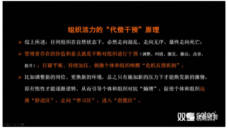 對於企業而言其實也是如此,如果(guǒ)一個企業總是在封閉而孤立當中,其組織關(guān)係也必(bì)然從簡單走向複雜,並(bìng)逐漸陷入混亂、無序和僵化,逐(zhú)漸失去活(huó)力(lì)直至走向了“死亡”。而(ér)避免“熵增”的唯一方法就(jiù)是管理者持續(xù)開放和組織幹預,從而打破平衡,持續加壓、刺激個體和組織喚醒“危機反饋機製”,從而讓個體和組織遠離“舒適區”,走向“學習區”,進入“恐(kǒng)慌區”,原有惰(duò)性才能逐漸逆轉,從而煥發出新的活力(lì)!樓仲平分享的“熵增定律”PPT頁麵