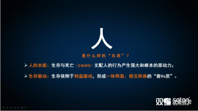 從上圖中大家可以看到(dào),無論人性之善還是人性之惡,其實都包含“利己驅動”。“利己”是人在長期的自然環(huán)境中為了獲得(dé)生存不得不獲得更多外部資源的內在驅動力,從而導致人總是會從(cóng)利己的角度去考慮如何更(gèng)快、更多(duō)的獲得。所以“人性本私”是無可非議的。