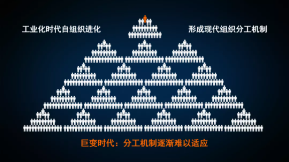 分工管理機製作為工業化時代的組織機製一般表現為授權管控、責權(quán)分明、組織形態呈(chéng)現穩定而僵化,以至於信息化時代來臨時企業內在的變化(huà)難以滿足外部變化和成員內在訴求變化(huà)時,組織缺陷就暴露無遺(yí),企業規(guī)模不斷擴張下,管控的難度呈現出指數級放大。
