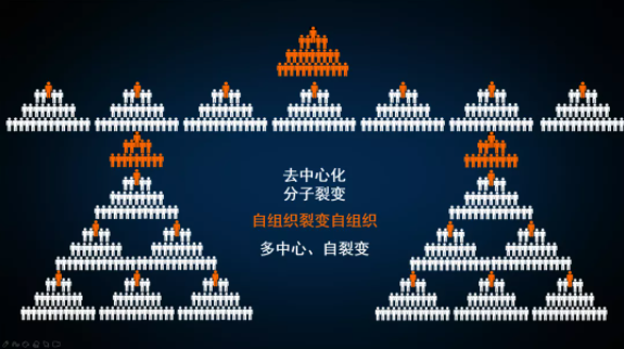 樓老師給大家提出了一個新的方案:由自組(zǔ)織分裂(liè)出自組織—實現子代事業部的分子裂變。鼓勵創(chuàng)業(yè)體自身裂變出(chū)創業體事業部控(kòng)股的創業(yè)項目,形成新的“自組織(zhī)集群”,形成各個創業體裂變後的自中心和多中心,從而形成雙(shuāng)童(tóng)多層架構的(de)創業矩(jǔ)陣!