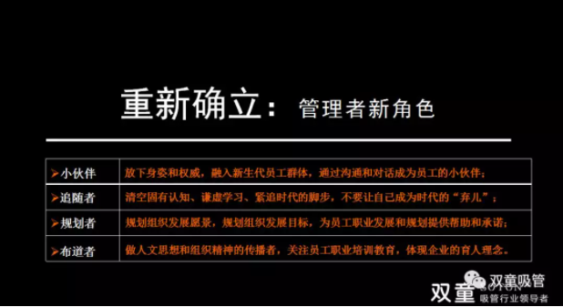 • 布道者:當企業發展到一定時期,管理(lǐ)者(zhě)從現場管理者就要轉變為文化塑造者,要(yào)成為員工的精神導師,做人文思想和組織精神的傳播者。關注員(yuán)工(gōng)職業培訓教育,體現企業的育人理(lǐ)念,這恰恰是數字(zì)化環境下管理者要去追求的方向。