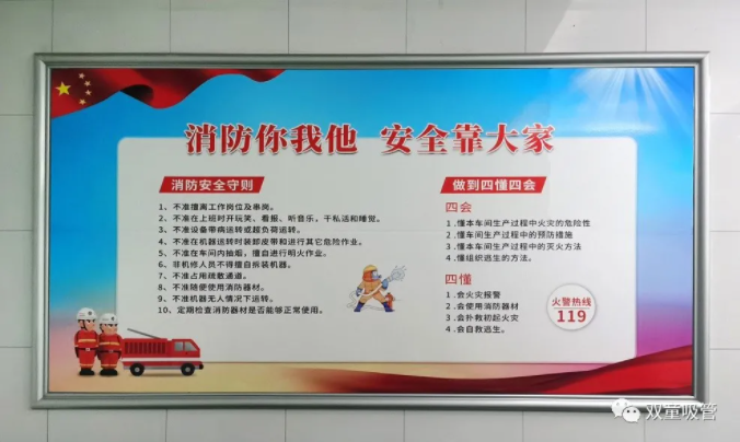 在“.17c嫩嫩草色视频”,各類宣傳(chuán)標識、消(xiāo)防器材隨處(chù)可見,安全意識深入人心!正是因(yīn)為“雙(shuāng)童”對安全生產(chǎn)的這(zhè)份敬畏之心,才讓每一位員工心中都築起了一道安全防線。