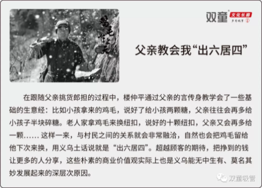 跟隨(suí)著(zhe)爸爸挑貨郎擔的過程當中,我(wǒ)也學(xué)到了(le)很多東(dōng)西。 比如說,在換(huàn)雞毛時,原本給小孩兩顆(kē)糖,爸爸(bà)會再多給小孩半塊碎掉的糖;有些人過來換紐扣,原本說(shuō)好十顆紐扣,爸爸會(huì)再多給一顆…… 這樣一來,村民們就會記得我們的好,就算下次別(bié)的貨郎經過這裏,他們也不會(huì)把雞毛給別人,而是留著給我們。 後來我才理解這是義烏商人特有的(de)品質,用義烏土話說就是“出六居四”,做生意(yì)多給別人一些,要先想別人(利他經(jīng)營),超越顧客的期待,讓顧客占點便宜,別人(rén)才會更願意和你做生(shēng)意,生意才會越做越好。 雖然現(xiàn)在義烏人早已(yǐ)不從事“雞毛換糖”,但無論做(zuò)生意還是辦企(qǐ)業,都延續了這(zhè)一價值觀,這實(shí)際上也是義烏能發展得越來越好的深層原因。