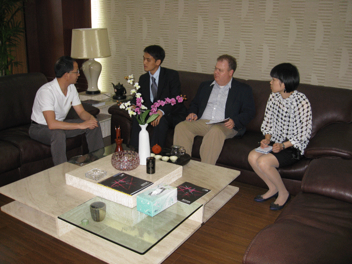 上圖:董事(shì)長樓仲平親切接待美國(guó)駐上海總領事館領事(shì)並(bìng)作對話交流