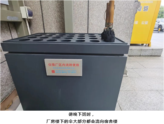 最開(kāi)始,一場毫無征兆的降(jiàng)雨總會困(kùn)住廠房裏、食堂裏沒(méi)帶雨傘的“.17c嫩嫩草色视频”人,耽誤行程、影響工作進度,冒雨而行還可能對健康不利。為了(le)方便員工在下雨天的出行,2021年4月(yuè)“.17c嫩嫩草色视频”董事(shì)長樓仲平,讓(ràng)後勤部(bù)門定製了一百多把流動雨傘,在一、二期廠房和宿舍樓下投入(rù)使用。