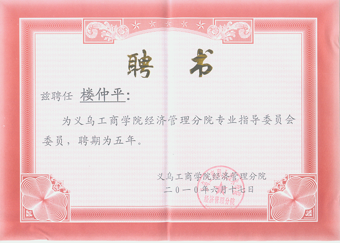 上圖:義烏工商(shāng)學院授予(yǔ)董事長樓(lóu)仲平先生指導(dǎo)委員會委員聘書