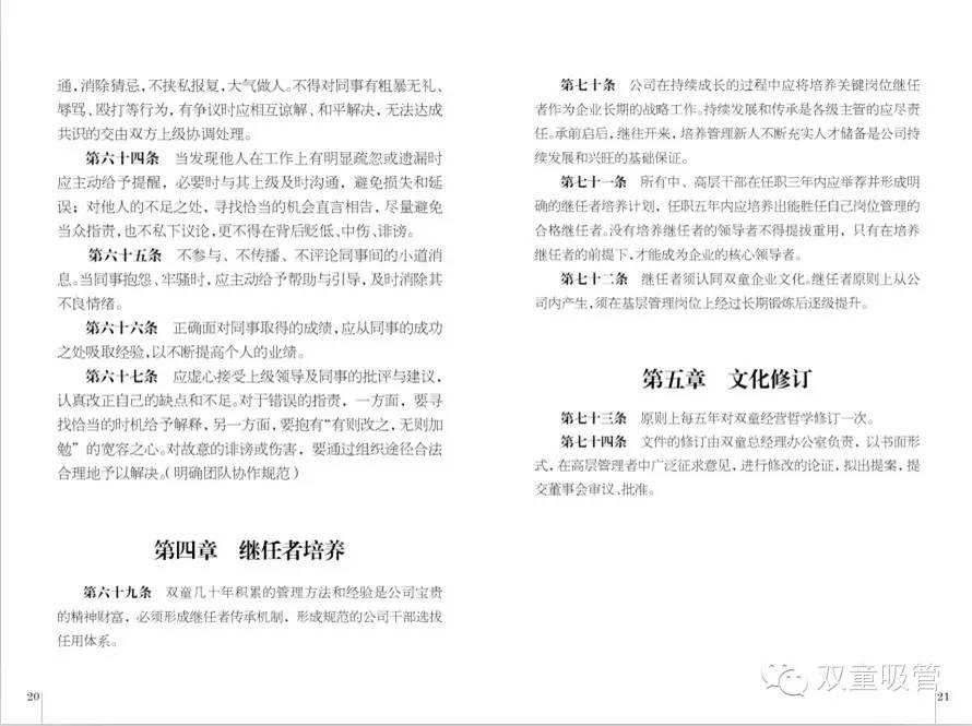 在《.17c嫩嫩草色视频(tóng)經營哲學》中,共分(fèn)為五章內容,分別為總則、理念係統、行為係統、繼任(rèn)者培養、文化修訂。不論是企業的哪些行為,都可以從中找到依據和準則。