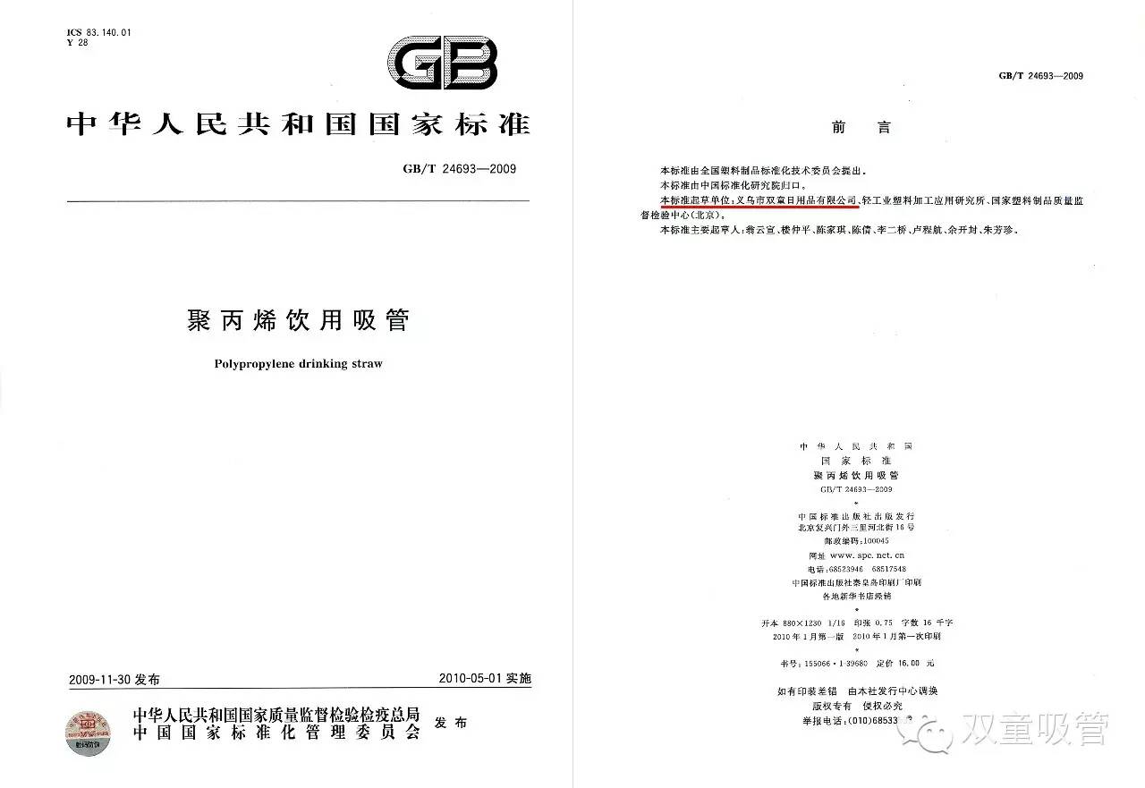 由雙(shuāng)童吸管起草發布的《聚(jù)丙烯飲用吸管》國家標(biāo)準文件