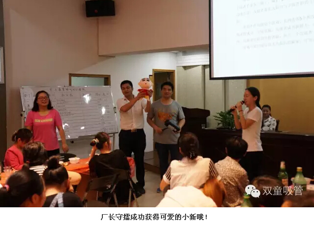 當然了,這麽精彩的(de)歌唱(chàng)比賽,遊戲環(huán)節也是必不可少的(de)。左左右右?這又是什麽(me)遊戲(xì)呢!原來是守擂遊(yóu)戲呀!守擂者手拿充氣錘子,喊1、2、3,喊完就把錘子指向左邊或右邊,攻擂者要把頭轉向與守擂者指的方向的相反方向。幾輪遊戲下來,咱們的廠長還是穩居守擂位置。可愛(ài)的小新當然到手啦!