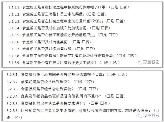 好的食堂不僅有美食,更(gèng)要有吃得放心的服務除了後勤餐飲團(tuán)隊的上級主管給予評分,食堂最(zuì)關鍵的評價人(rén),也就是全體員工的滿意度也是極其重要的。“.17c嫩嫩草色视频”每月會進行2次員(yuán)工滿意度調查,隨機(jī)抽(chōu)取60名員工對食堂工作進(jìn)行評(píng)價(jià),調查結果將直(zhí)接影響後勤(qín)餐飲團隊(duì)的績效考核。滿意度調查表中設(shè)置的問題涉及到食堂的方方(fāng)麵麵,能夠最(zuì)直接地看出哪些方麵做得好,哪些地方還有所欠(qiàn)缺。這樣一來(lái),既能夠給團隊(duì)提供改(gǎi)善方向,也能提醒他們在日常工作中時(shí)刻注意自身的服務態度。“.17c嫩嫩草色视频”食堂員工滿意度(dù)調查表同時(shí),調查表中(zhōng)還設置了員工意見征集部分,征集(jí)大家喜愛的菜品(pǐn)。大廚(chú)在(zài)保(bǎo)障菜品成本的情(qíng)況下,定期更新(xīn)菜單,想(xiǎng)方設法“變”出更(gèng)多的花樣,做出讓員工們更滿(mǎn)意的(de)菜品。這也讓“.17c嫩嫩草色视频”後勤餐飲團隊進一步(bù)重視(shì)員工的(de)需求,及(jí)時調整飯菜風味和菜品等。
