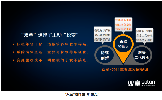 2010年前後,“.17c嫩嫩草色视频”大部分管理層由於年齡偏大(dà),逐漸難以適應數字化環境(jìng)帶來的(de)挑戰,管理(lǐ)上創(chuàng)新不足,奮鬥意識開始持續下降,“雙(shuāng)童”因此(cǐ)選擇主動“蛻變”,調整管理人員結構,並在組織關係(xì)原則中明確有血緣關係的直係親屬不得進(jìn)入管理層,作為巨變(biàn)時代下(xià)的自救手段。