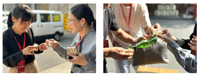研學班學員在社長講解下,詳(xiáng)細參觀了整個酒造場的生產過程(chéng)。跟著社長“逛”了一圈兒,大家早就(jiù)被酒香“陶醉了”,已經忍不住要體驗一下了~從生產車間出來,大家又被酒造場戶外的綠色深深吸引,整個酒造場宛若建在(zài)叢林深處,清新、宜人,精妙的(de)綠色環保型廠區讓學員們紛紛化身(shēn)“好奇寶寶(bǎo)”,迫不(bú)及待地邀請社長答疑~