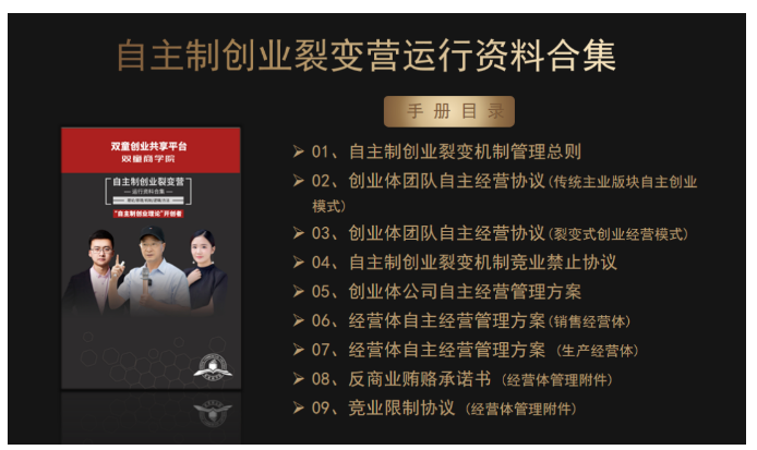 3、交付自主製(zhì)創業裂變模式(shì)的各項規則、文本、合同等(děng)書麵資料