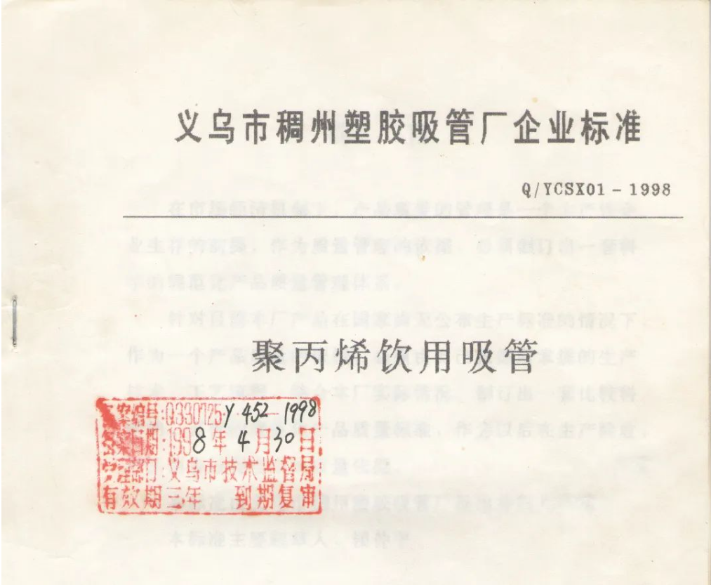 1998年 | 《聚丙(bǐng)烯飲用吸管》企業產品標準 |