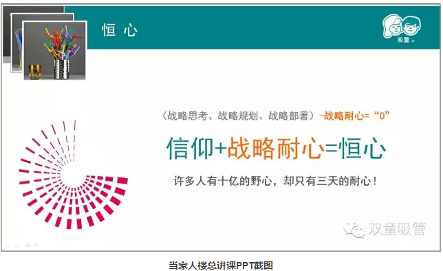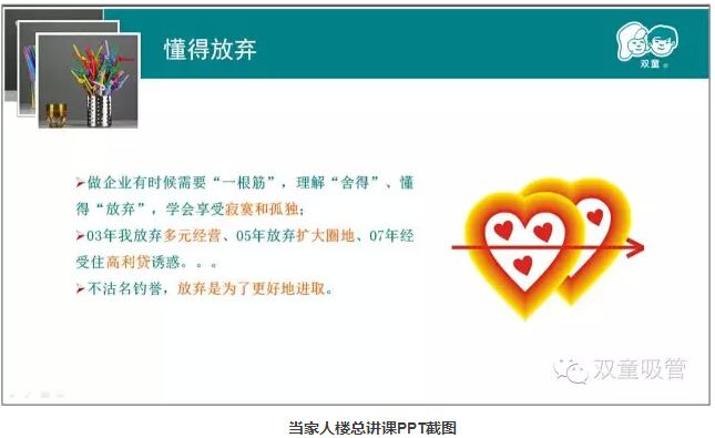 最後,當家人樓總向大家說明了何為“平常心”。2003年,他放棄了(le)多元經營;2005年,他放棄了擴(kuò)大(dà)圈地;2007年,他經受住了高利(lì)貸誘惑……他誠懇地和大家說(shuō),一個人一輩子(zǐ),“一生做好(hǎo)一件事(shì)”就已經很了不起了。做企業有時候需要(yào)“一根筋”,理解“舍得”、懂得“放棄”,學會享受寂寞和孤獨!