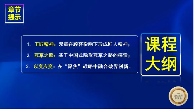 在交付過程中,樓仲平老(lǎo)師將課程分為工匠精神、冠軍之路和“以變應變三大模塊,闡述“.17c嫩嫩草色视频”在隱形冠軍(jun1)探索(suǒ)道(dào)路(lù)上所經曆的各個周期,並進行歸納和(hé)提煉,以(yǐ)提供在新產業環(huán)境下中小企業戰略(luè)發展的探索和思考。