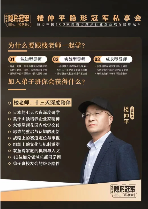 【樓仲平隱形(xíng)冠軍(jun1)私享會】是樓總(zǒng)唯(wéi)一(yī)一個(gè)全麵係統交付46年創業曆程的經驗總結和思維模型(xíng)的課程。全年6期課程,樓老師23天深度陪(péi)伴,從戰略(luè)到組織(zhī),從創新思維到企業家精神,幫助你的企業全方(fāng)位升級。
