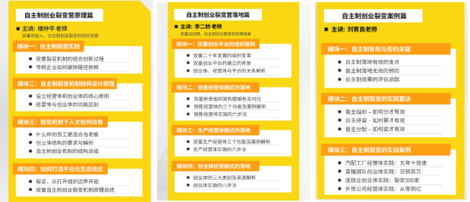 理論是實踐的基礎,先弄清楚機製的運行原理,才能談得上有效實踐!所以在課程交付過程中,講師(shī)樓仲平會花(huā)費一整天的時間,將課程幹貨分為四大模塊,共11小節,為學(xué)員深度解析自主製創業裂變的機(jī)製原理!