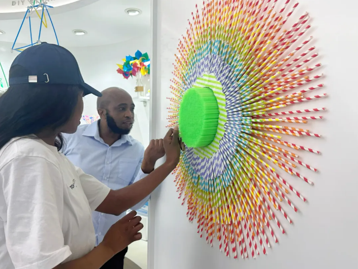 在探索創新產品體驗區和DIY吸管展示區的奇妙之旅中,各式各樣的吸管猶如藝術品般映入眼簾:活靈活現的動物卡通吸管(guǎn)、內置風輪隨水(shuǐ)輕舞的風車吸管、由吸管搭建出的形態各異的模型……