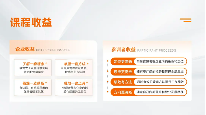 學(xué)完(wán)課程(chéng)之後(hòu),更加(jiā)意識到(dào)了企業使命願景價值觀的重要性,理解了(le)這些之後,我作為管理層,現在可以自主的去(qù)找對應的解決方案(àn),而(ér)不是等著領導。