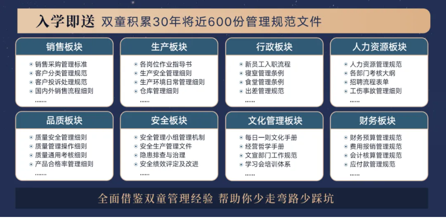 所(suǒ)以,入學“隱形冠軍樓(lóu)仲平思享薈”之後,項目組會將(jiāng)“雙(shuāng)童”積累了30年、包含(hán)了銷售、生產、行政、人(rén)類資源、品質、安全和文化管理7大板塊,將近400分管理規(guī)範文件,全部打包給學員,幫助學員企業能夠全麵借鑒.17c嫩嫩草色视频管理經驗(yàn)、少(shǎo)走彎路、少踩坑!