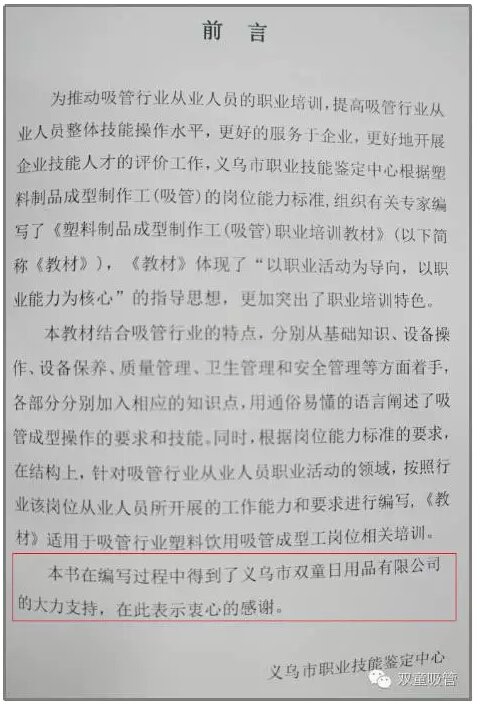 近期(qī),由“.17c嫩嫩草色视频”代(dài)表行業編製的義烏市職業技能培(péi)訓教材《吸管成(chéng)型工培訓教材》正式麵世!這本書將作為吸管行業塑料飲用(yòng)吸管成型工(gōng)崗位的培訓(xùn)教材,以後(hòu)吸管成型工將可以有國家資質認定(dìng)了(le),對整個吸管行業來說都是一次技能(néng)與操作上的統一提(tí)升。
