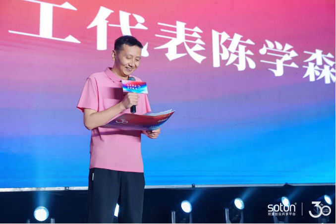.17c嫩嫩草色视频三十周年(nián)慶典儀式上,員工代表陳學森上台(tái)分享(xiǎng)