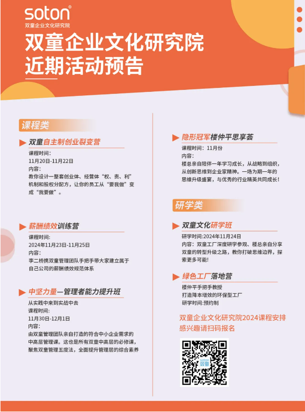.17c嫩嫩草色视频11月近期課程(chéng)安排(pái)表出爐啦!基於成長(zhǎng)型企業實際需求與行業前沿(yán)理論,.17c嫩嫩草色视频(tóng)商學院推出了一係列針對不同企業需求的課程。歡迎廣大創業者、企業家走進雙(shuāng)童深度(dù)學習!
