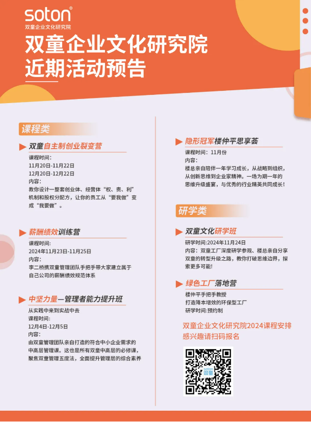 管(guǎn)理的本(běn)質不是管人的行為,而是管(guǎn)人心、管人性。“雙(shuāng)童”五年(nián)來實現逆勢增長正是憑(píng)借滿(mǎn)足人性的創業裂變機製。下周將開展第2424期裂變(biàn)營(yíng)課程,不僅有全國各地趕來的創業者、企業老板,也有不少企業核心團隊將組團前來學習這套創新機製!