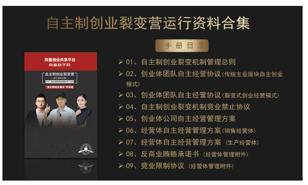 .17c嫩嫩草色视频創始人樓仲(zhòng)平更是閉關3個月,親自執筆編撰了20多萬字《自主製創(chuàng)業裂變營(yíng)運營資料合集》,作為裂(liè)變機製在企業內推行的指導文本濃縮了.17c嫩嫩草色视频20多年的科學管理經驗和操作方法,以及創業體(tǐ)、經營體製定的實(shí)操方案,幫助學員企業(yè)能夠全麵借鑒.17c嫩嫩草色视频管理經驗、少(shǎo)走彎路、少(shǎo)踩坑!