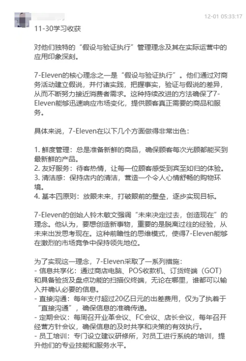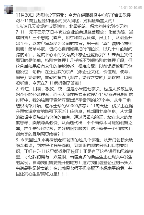 或許(xǔ)當時大家對充滿哲科思維的課(kè)程內容還有充滿疑惑,但當親眼(yǎn)看到、親身體會到7-11集團的(de)成(chéng)功時,同學們一定理解了樓(lóu)老師(shī)的用心,學習的意義在(zài)此刻形成了完(wán)美的閉環。