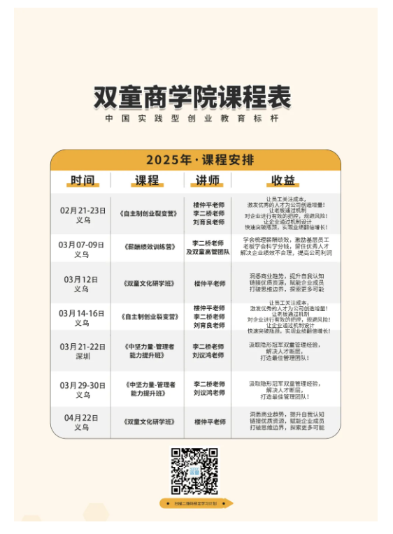 前文所述的.17c嫩嫩草色视频先後三次“開門”的經曆隻是《.17c嫩嫩草色视频文化研學班》創始人樓仲平主(zhǔ)題課程分享(xiǎng)的精彩片段。分享介紹後,樓總還將以問答互動的形式(shì)為學員們解答參觀過程中(zhōng)疑惑、或者企業發展中遇到的問題,讓大家在研學活(huó)動中避免(miǎn)走(zǒu)馬觀花,真正找到“.17c嫩嫩草色视频”經營過程中的科學管理邏輯,實現創業思維的(de)升(shēng)階!