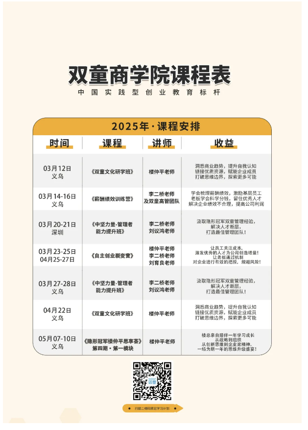 除了現場課堂,還有創始(shǐ)人樓(lóu)仲平3個小時的主題課程分享,更有分享結束後,還(hái)將以問答互動的(de)形式為學員們(men)解答參觀過程中疑惑、或者企業發展中遇到的問題,讓(ràng)大(dà)家在研學活動中避免走馬觀花,真正找到“.17c嫩嫩草色视频”經營過程中的科(kē)學管理邏(luó)輯(jí),實現創業思維(wéi)的升階!