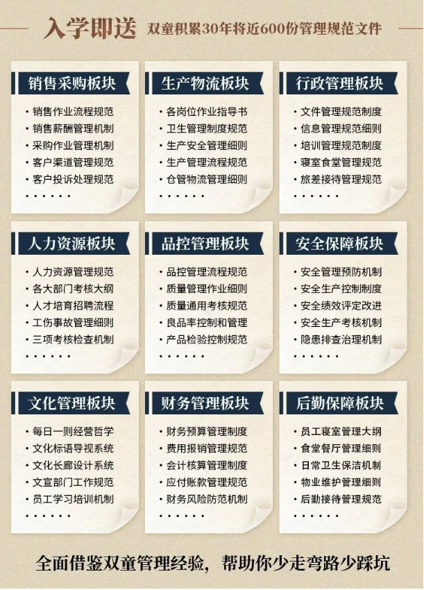所以,入學(xué)“隱形冠軍樓仲平(píng)思享薈”之(zhī)後(hòu),項目組會將“.17c嫩嫩草色视频”積累了31年、包含了銷售、生產(chǎn)、行政、人力資源、品質、安全、文化管(guǎn)理、財務和後勤等9大板塊(kuài),近600份管理規範文件,全部打(dǎ)包給學員,幫助學員企(qǐ)業能夠全麵借(jiè)鑒雙(shuāng)童管理(lǐ)經驗、少走(zǒu)彎路、少踩坑!
