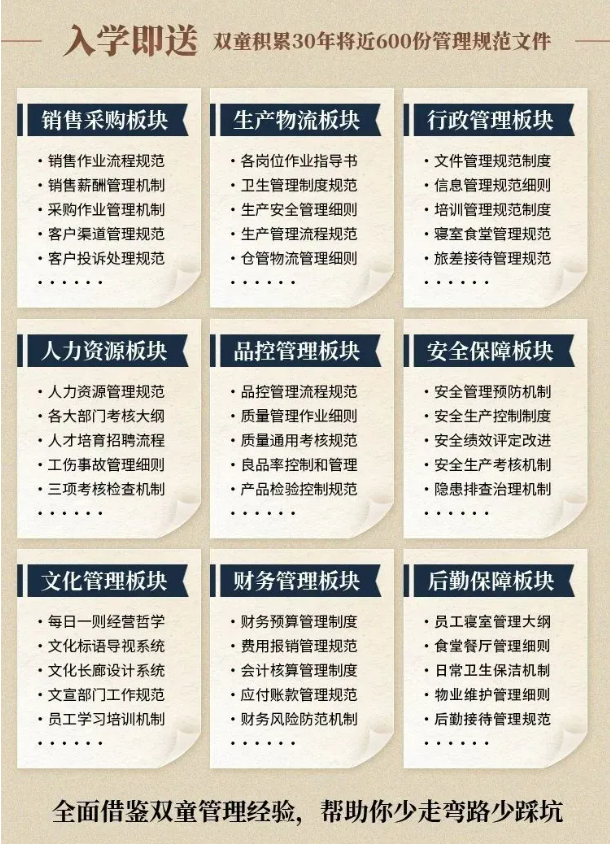 所以,入學(xué)“隱形(xíng)冠軍樓仲平思享薈”之後,項目(mù)組會將“雙(shuāng)童”積累了31年(nián)、包含了銷售(shòu)、生產、行政、人(rén)力資源、品控、安(ān)全、文化管理、財務和後(hòu)勤等9大板塊,近600份管理規範(fàn)文件,全部打(dǎ)包(bāo)給學員,幫助學員企業(yè)能夠全麵借鑒.17c嫩嫩草色视频管理經驗(yàn)、少走彎(wān)路、少踩坑!