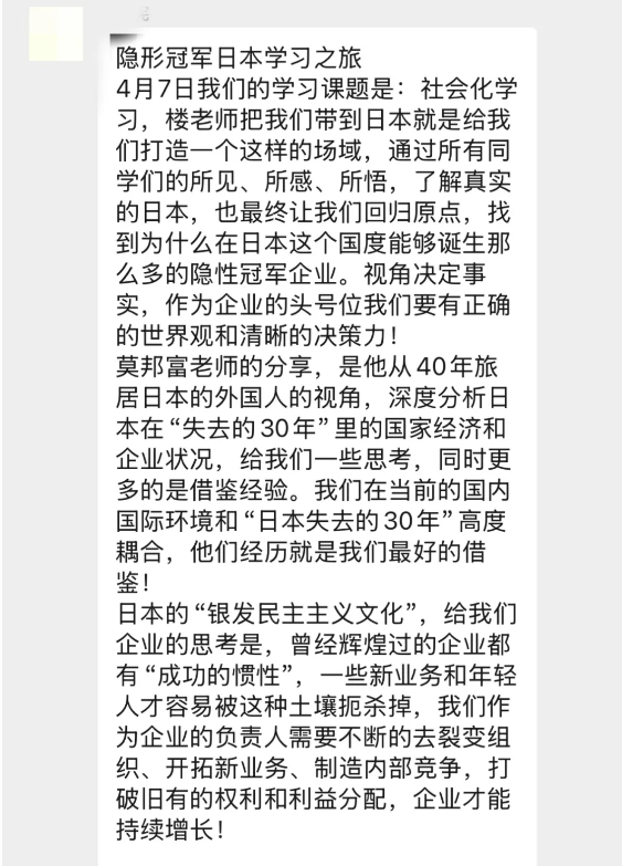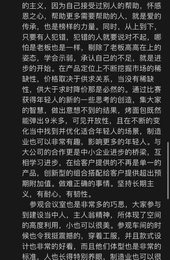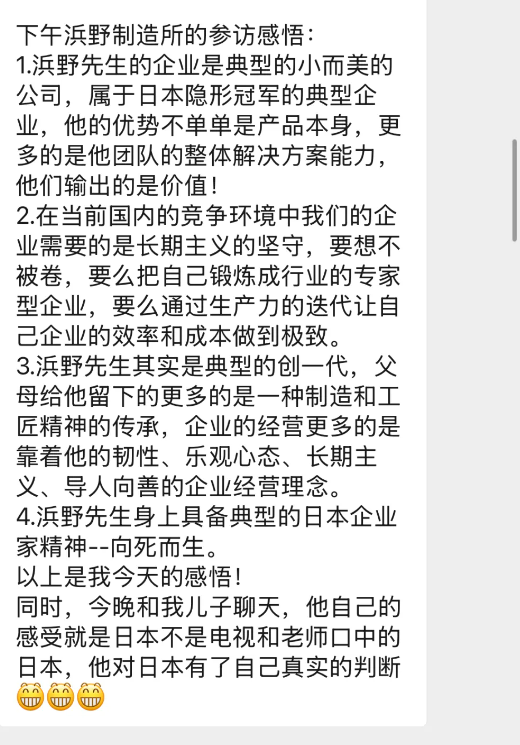 所以,在第一天(tiān)的研學結束之後(hòu),同學們(men)不僅(jǐn)收獲了很多關於精細化管理等企業經營的新靈感,對自身企業(yè)未來的經營方向也有了新的思考與感悟: