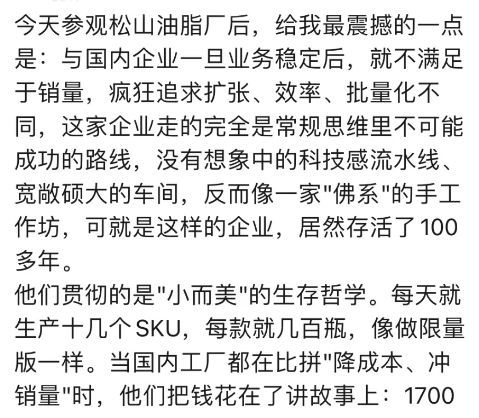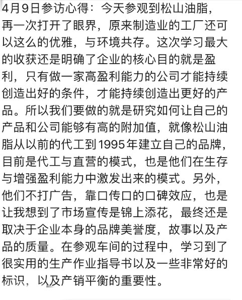 這次參(cān)觀鬆山油脂的富士山工廠(chǎng),也讓同學們(men)深刻(kè)體會(huì)到了鬆山油脂對產(chǎn)品製造的嚴謹態(tài)度,同時更加深入(rù)了解日本傳統(tǒng)日化製造業的發展和(hé)現代管理,學習如何在堅守傳統(tǒng)的同時,實現品(pǐn)牌化與市場化發展。