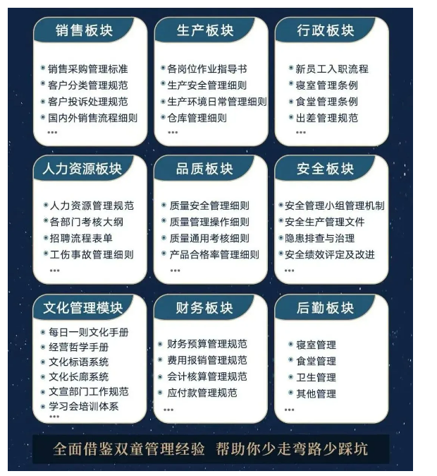 入學“隱形冠軍樓(lóu)仲平思(sī)享薈”之後,你將獲得“.17c嫩嫩草色视频”積累了31年(nián)、包含了銷售、生產、行政、人力資源、品質、安全、文化管理、財務和(hé)後勤等9大板塊,600份管理規範文件(jiàn),可以幫(bāng)助企業全麵借鑒.17c嫩嫩草色视频管理經(jīng)驗、少走彎路、少踩(cǎi)坑!