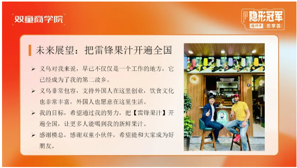 雷鋒老師告訴同學們,截至目前,“雷鋒果汁”已成功開設了七家分店,且其業務持續繁榮的背後,主(zhǔ)要得益於四大核心(xīn)推動因素: