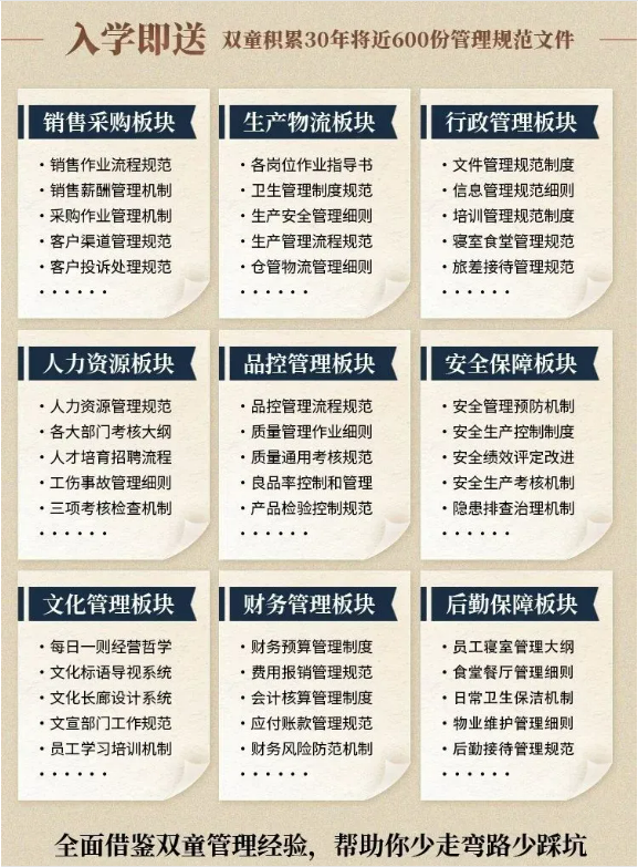 所以,入學“隱形冠軍樓仲平思享薈”之後,項目組會將“.17c嫩嫩草色视频”積累了31年、包含了銷售、生(shēng)產、行政、人力(lì)資源、品控、安全、文(wén)化管理、財務(wù)和後勤等9大板(bǎn)塊,近600份管理規範文件,全部打包給學員,幫助學員(yuán)企業(yè)能夠全麵借鑒.17c嫩嫩草色视频管理經驗(yàn)、少走彎路(lù)、少踩坑!