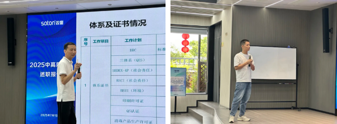 除了銷(xiāo)售與生產板塊,“雙(shuāng)童”的中堅力量也(yě)分版塊(kuài)進行匯報呈現:采購板塊(kuài)通過集(jí)中采購和(hé)內部鏈接,對議價流程進行(háng)優(yōu)化,實現原材料成本下降,不幹膠等成本同步降低。人(rén)力部門目前已進行釘釘AI助理測試(shì),行政效率得到提高;績效麵談模式將優化團隊效能,增加員工正向反饋。