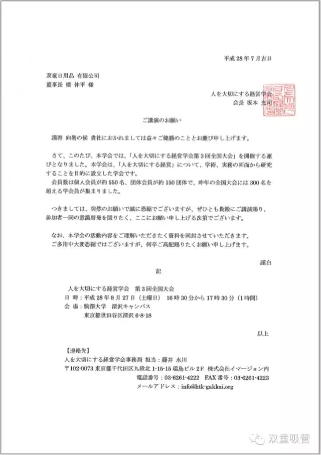 2016年8月27日下午,當家人樓總受日(rì)本法政大學阪本光司政策研究院邀請,參加在日本駒澤大學學術報告廳舉行的“日本以(yǐ)人(rén)為本經營大會第三屆全國(guó)大會”上作主題演講。